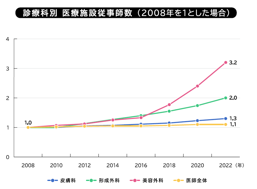 こうした需要増と市場拡大に呼応して、若手医師や開業希望者が、保険診療では得られない高額報酬や自由度を求めて美容医療に流れる動きが出ている。下の図は、2008年の医療施設従事医師数を1としたときの、2022年までの増加率を示す。医師全体の増加推移と比較して、美容外科が大幅にその人数を増やしていることが分かる。