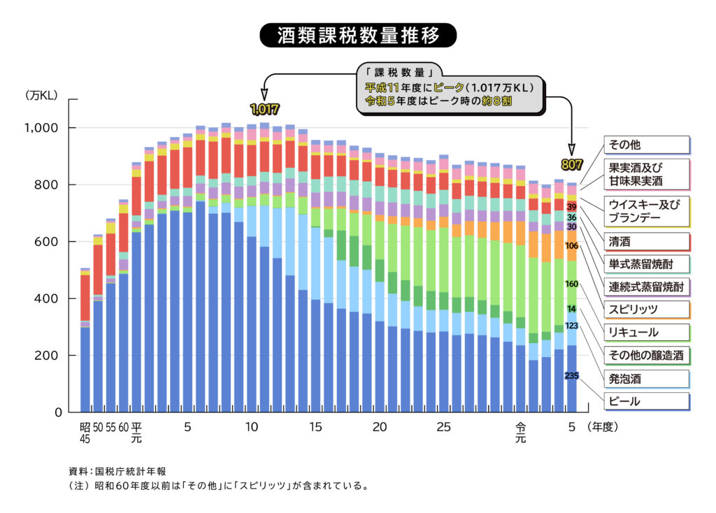 国内出荷量のピークは1973年(昭和48年)に177万キロリットルあったのに対し、2023年(令和5年)は約39万キロリットルと、4分の1以下に落ち込んだ。右肩下がりのカーブが止まらない。