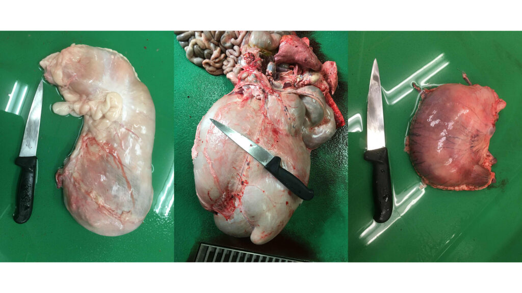 「これ、俺が解体した時に撮ったクマ、シカ、イノシシの胃袋の写真ね。クマは体重120㌔ある大きい個体だったな。シカは70㌔で大きめ、イノシシは65㌔でやや小ぶり。見てもらうと一目瞭然だけど、シカは胃袋がこんなに大きい」