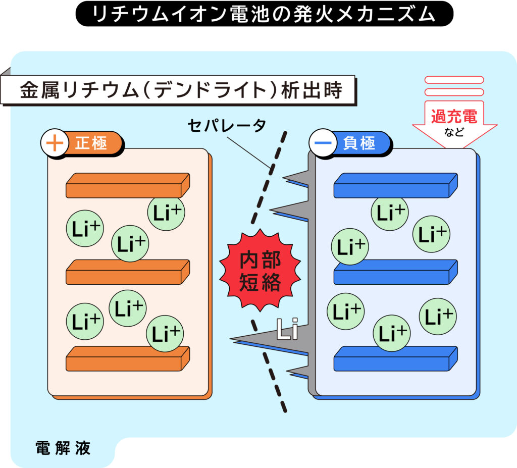 根本原因はリチウムイオン電池特有の構造にある。内部短絡(ショート)が起きると瞬時に高温となり「熱暴走」を引き起こす。適切に使用していても、高温環境や劣化が重なれば事故は避けられない。利便性と危険性が背中合わせにあるのだ。